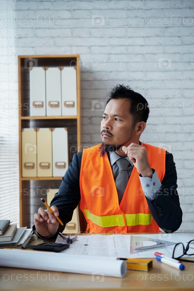 Нахмурившийся строительный инженер сидит за рабочим столом
