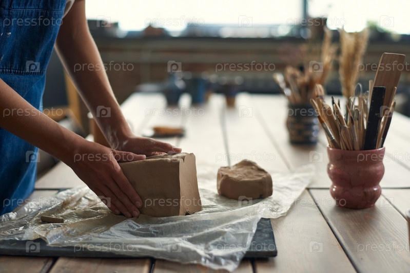 Руки ремесленницы, держащей большой кусок глины во время работы