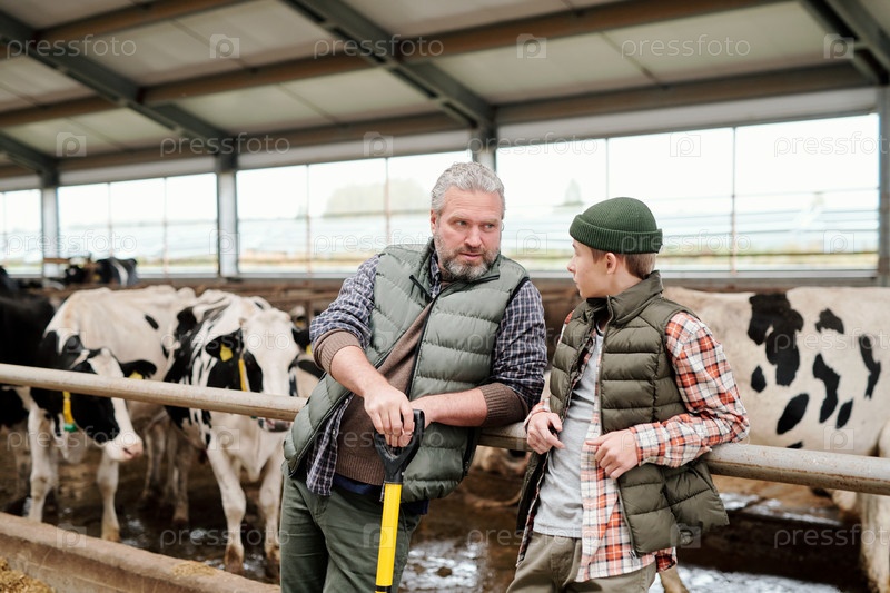 Зрелый седой владелец животноводческой фермы разговаривает с мальчиком-подростком у большого падока