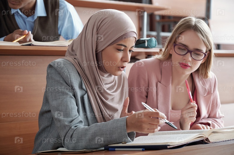 Две интеркультурные студентки сидят за столом в лекционном зале и обсуждают отрывок из книги