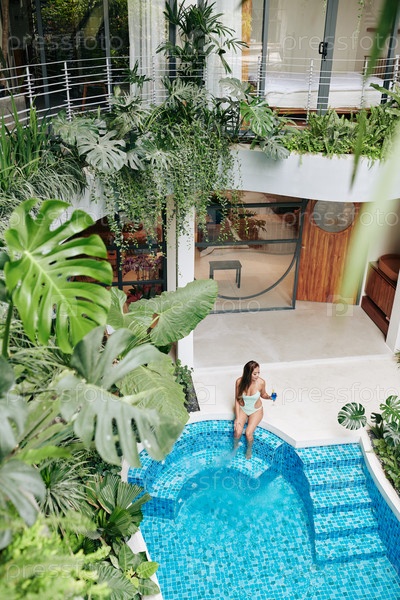 Женщина сидит у бассейна