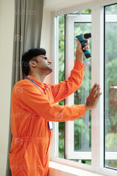 Специалист по установке окон с использованием электрической отвертки