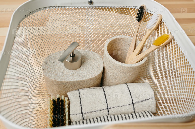 Группа экологически чистых предметов по уходу за телом внутри корзины