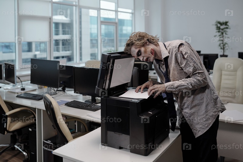Зомби-бизнесмен стоит у ксерокоста в офисе