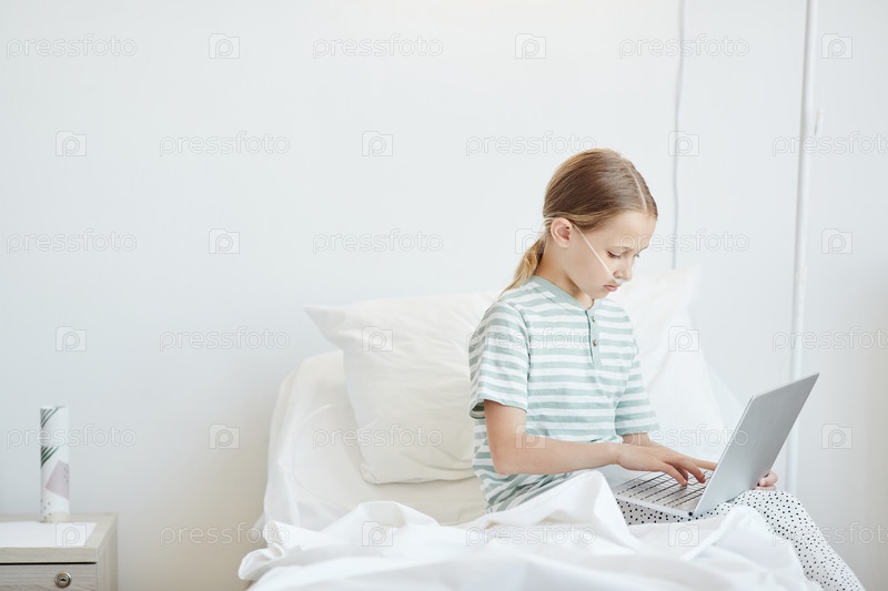 Девушка, использующая ноутбук в больничной комнате