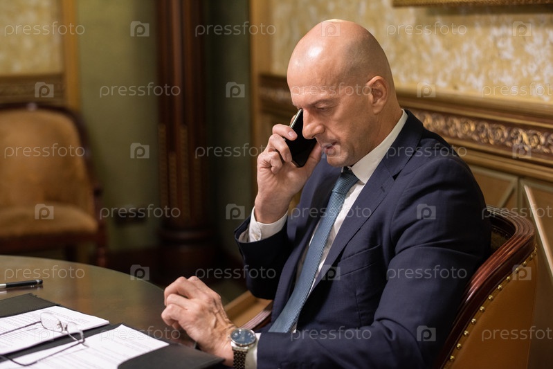 Зрелый бизнесмен в элегантном костюме устраивает встречу с кем-то