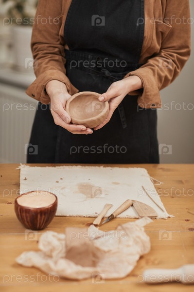 Молодая женщина делает керамическую чашу в мастерской
