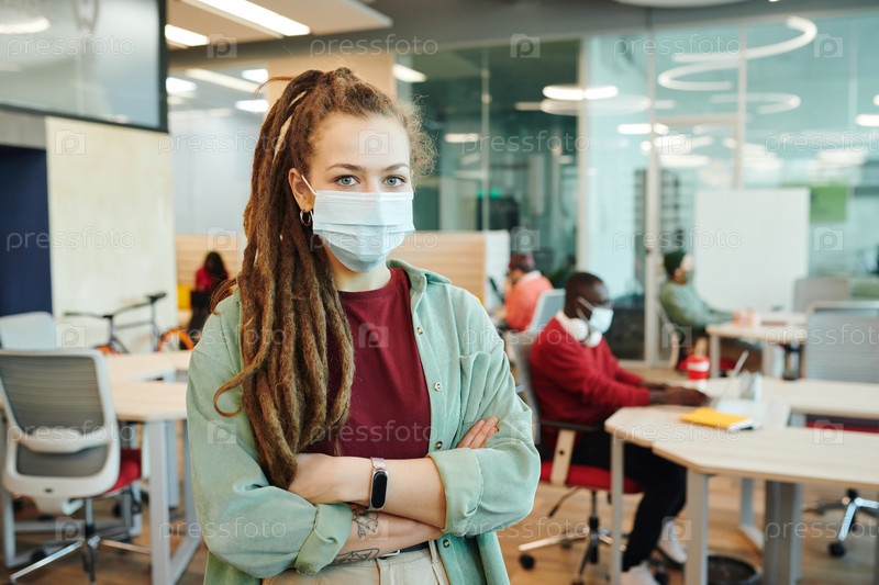Молодая женщина-менеджер открытого пространства в защитной маске, скрестив руки за грудь