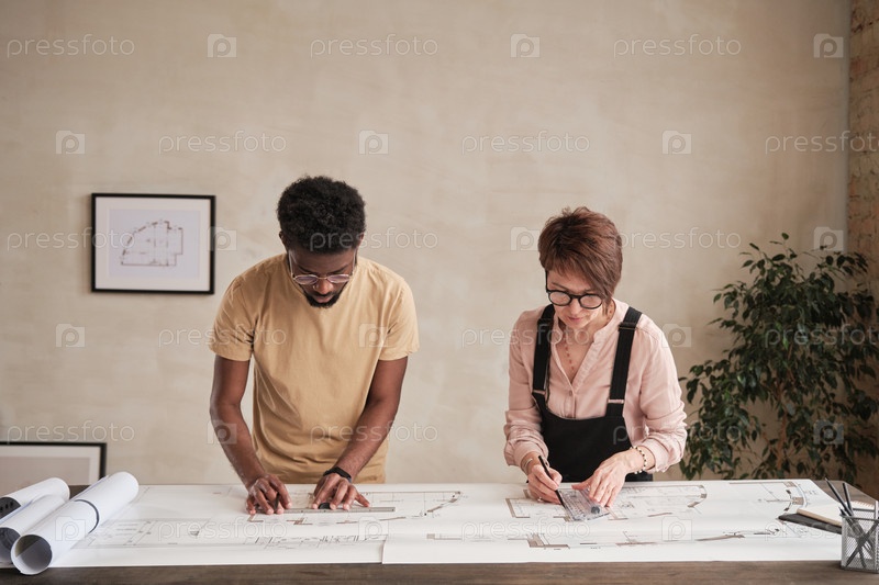 Межрасовые дизайнерские архитекторы изучают план здания