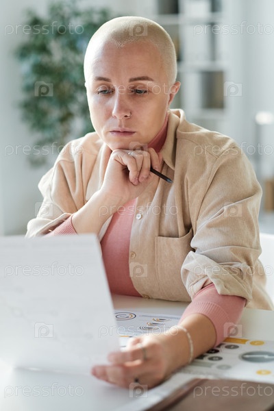 Серьезная молодая лысая бизнес-леди в обычном наряде сосредоточилась на бумажной работе, сидя за офисным столом и рассматривая документы