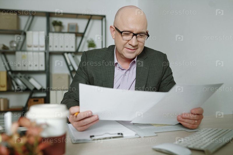 Содержание лысый бизнесмен, читающий газеты в офисе