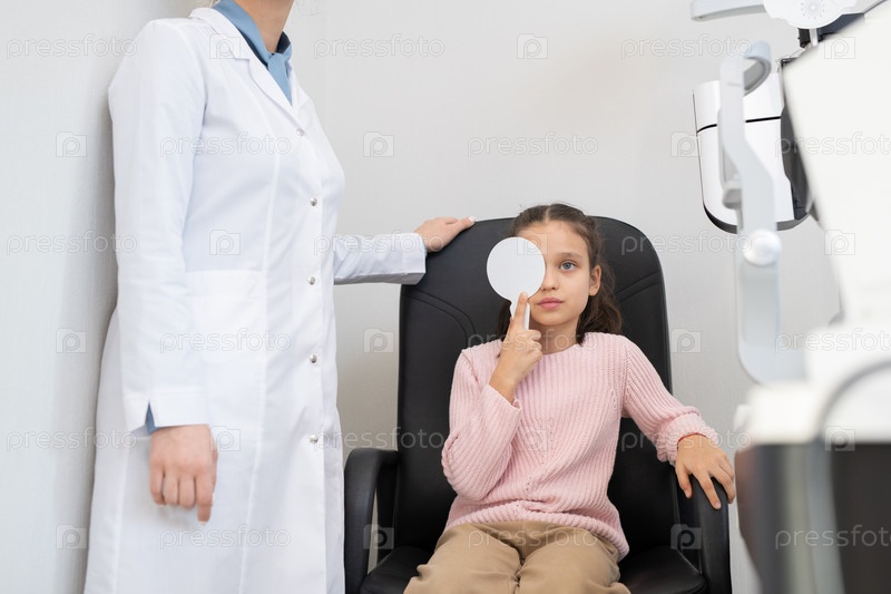 Милая маленькая девочка в повседневной одежде делает тест на зрение в современных офтальмологических клиниках