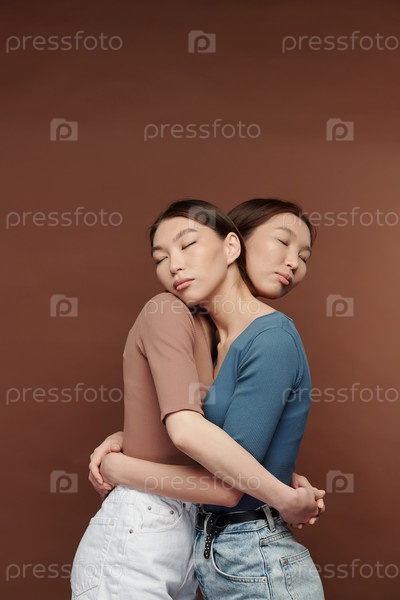 Две молодые ласковые близнецы азиатской этнической принадлежности, стоящие в объятиях