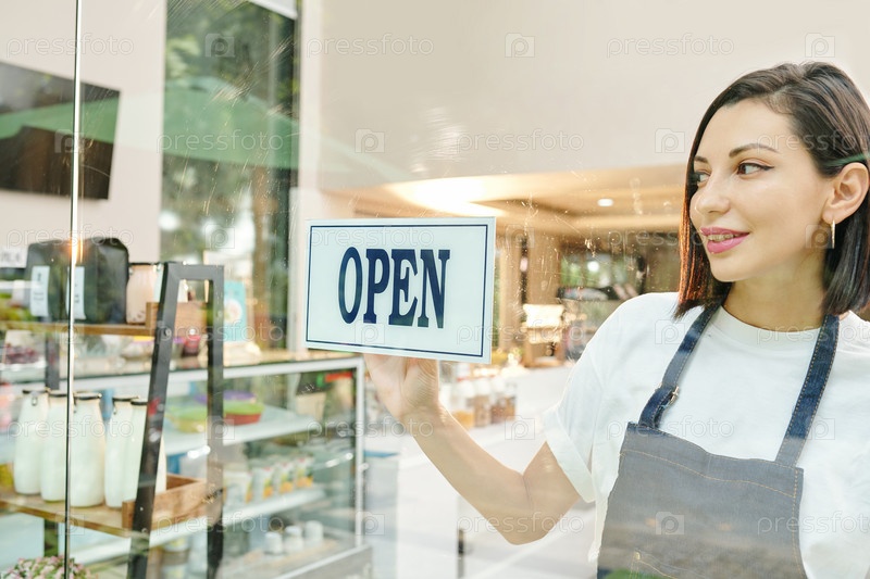 Женщина наклеивает открытый знак
