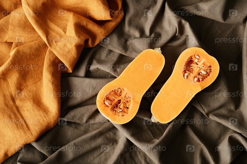 Выше вид двух кусочков тыквы, помещенных на морщинистой серой ткани, осенний сбор урожая концепция