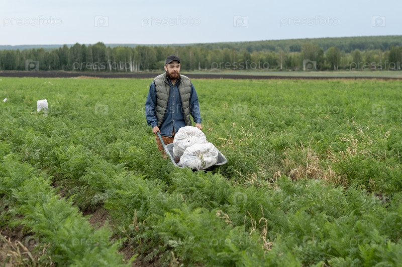 Бородатый фермер толкает тележку с мешками, двигаясь вдоль растущей растительности