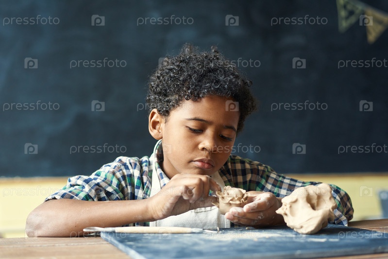 Милый африканский школьник делает глиняный предмет во время урока ремесла