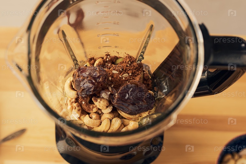 Электрический блендер с ингредиентами для смузи стоит на столе