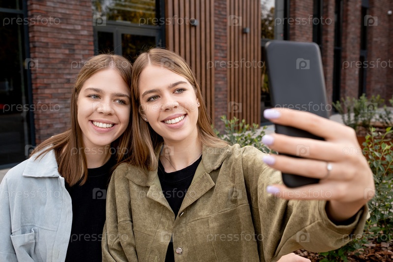 Две милые девушки с светлыми волосами делают селфи на свежем воздухе