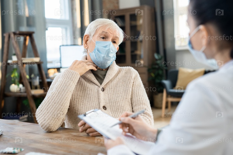 Больной пожилой мужчина в обычной одежде и защитной маске разговаривает с молодой женщиной-врачом