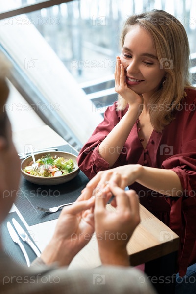 Счастливая молодая женщина смотрит, как ее парень надевает обручальное кольцо на палец