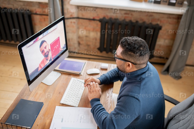 Зрелый мужчина смотрит на учителя экономики на экране компьютера