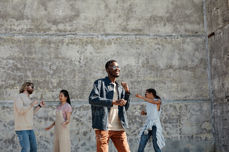 Разнообразная группа молодых людей танцуют на свежем воздухе