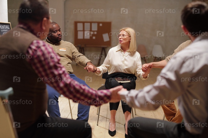 Несколько пациентов группы психической поддержки держатся за руки во время сеанса, сидя в кругу