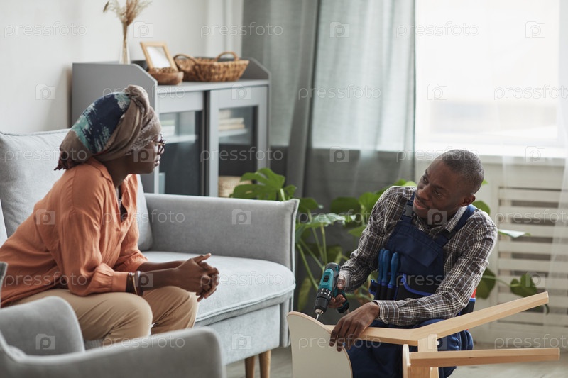 Афроамериканская женщина разговаривает с ремонтником