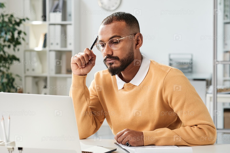 Серьезный занятый молодой ближневосточный маркетолог с бородой, держащий ручку и смотрящий на экран ноутбука во время работы над стратегией в офисе