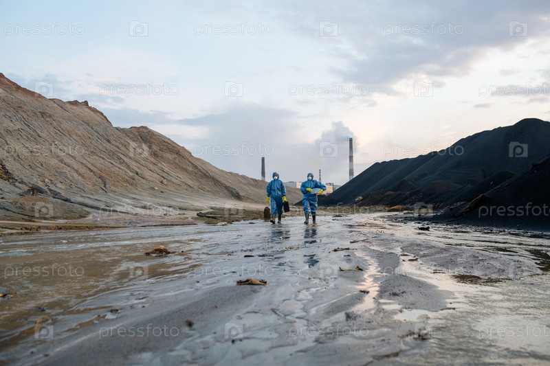 Фигуры двух ученых в синих защитных комбинезонах, движущихся по дороге, покрытой грязью