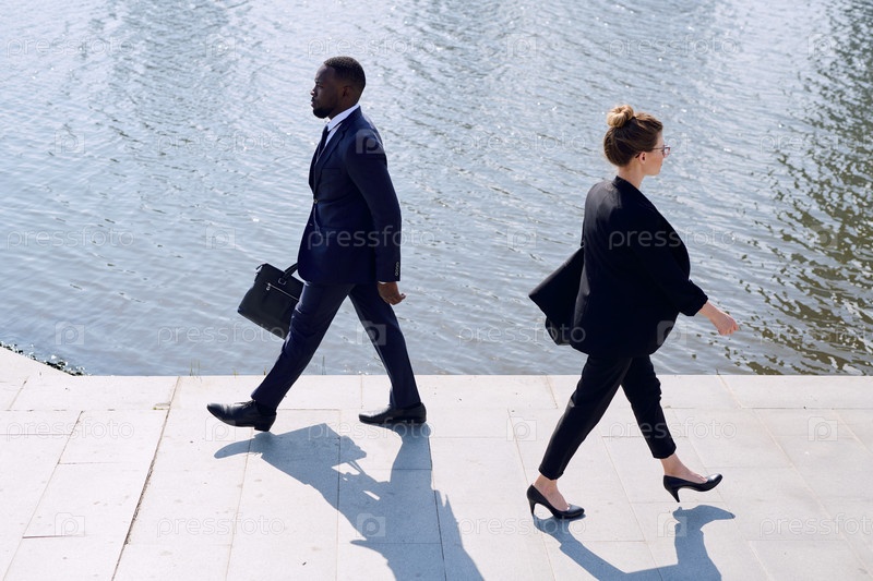Молодые современные межкультурные бизнес-профессионалы в элегантных костюмах движутся по тротуару