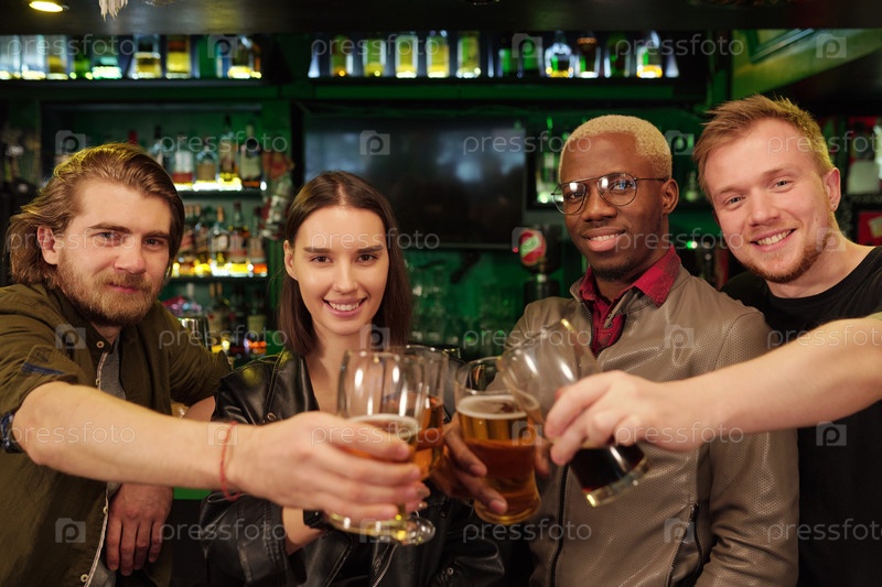 Молодые улыбающиеся футбольные фанаты, стучащиеся со стаканами пива перед камерой
