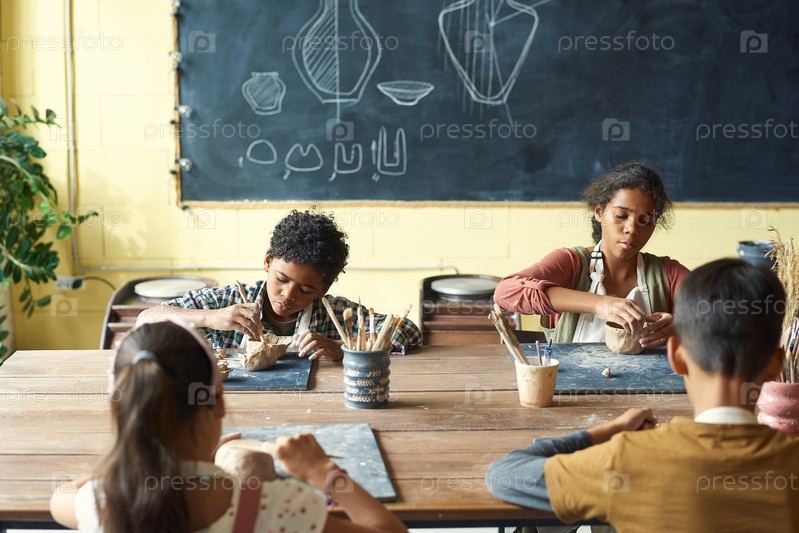 Милые творческие школьники скульптуруют глиняные кружки или миски