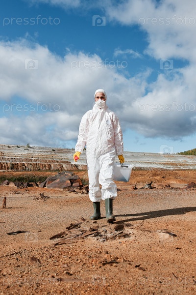 Экологический исследователь в перчатках, резиновых сапогах и Hazmat suit ходит по загрязненной земле и несет контейнеры с образцами почвы