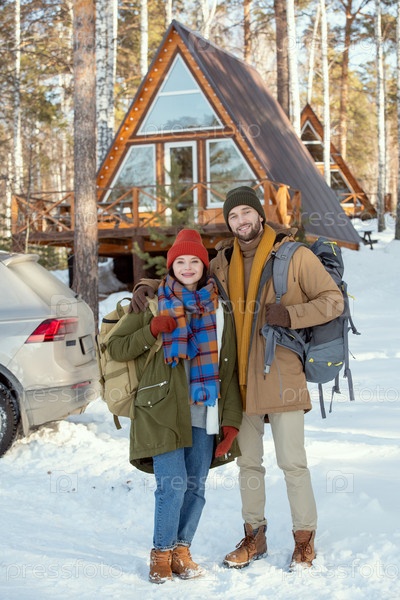 Молодая веселая пара с рюкзаками, стоящими напротив своей машины и дома