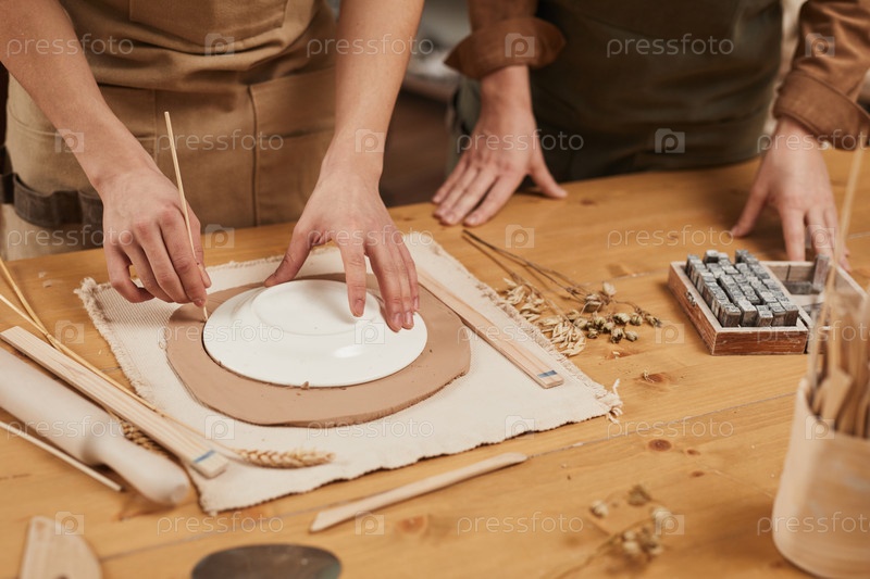 Женская горшечник, делающий керамику вблизи