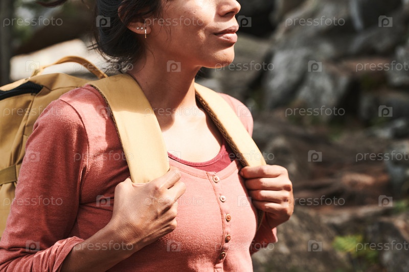 Ближайший снимок вдохновленного контента женщины-путешественницы в розовом свитере, держащей ручки рюкзака и оглядываясь вокруг