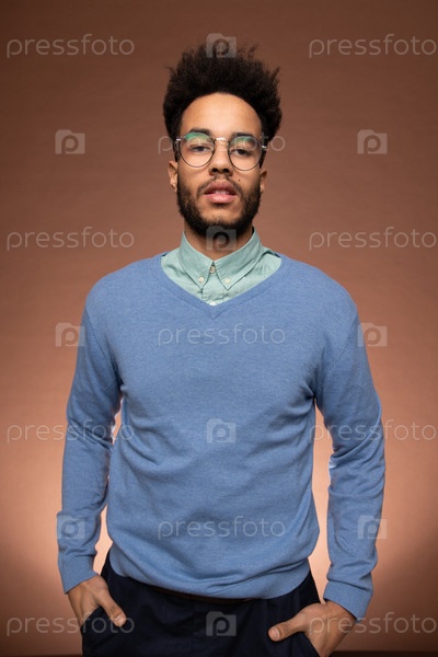 Молодой бизнесмен в умной повседневной одежде держит руки в карманах штанов