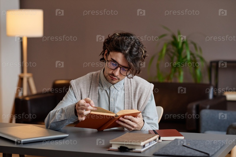 Горизонтальный средний снимок современного профессионального психолога, сидящего за столом в своем офисе и читающего книгу во время ожидания клиента