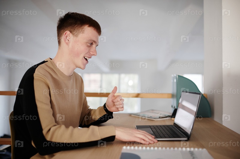 Молодой человек разговаривает онлайн на ноутбуке