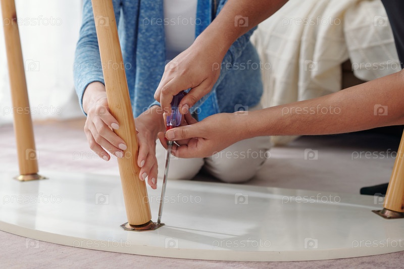 Руки исправляют сломанный стол