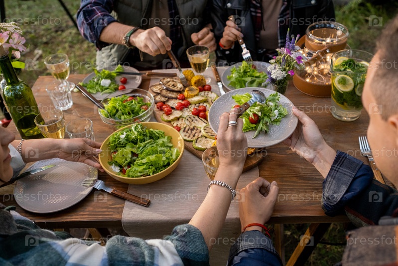 Рука молодой женщины, кладящей овощный салат на тарелку своего парня
