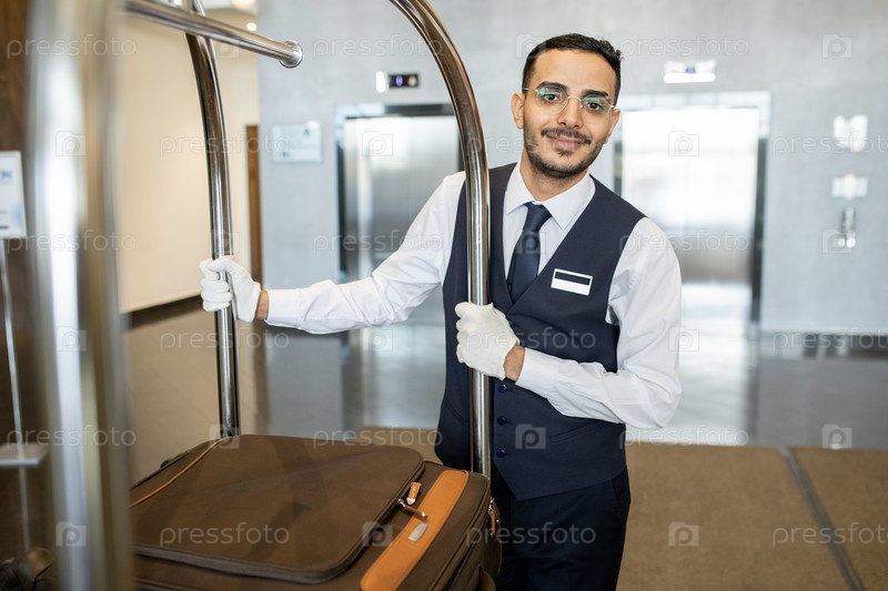 Молодой привратник в форме и очках толкает тележку с чемоданами, двигаясь по коридору