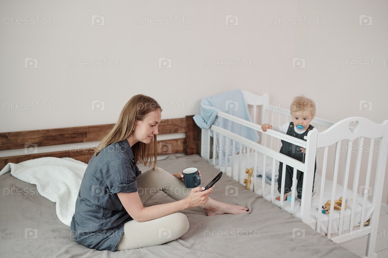Молодая мать прокручивает социальные сети