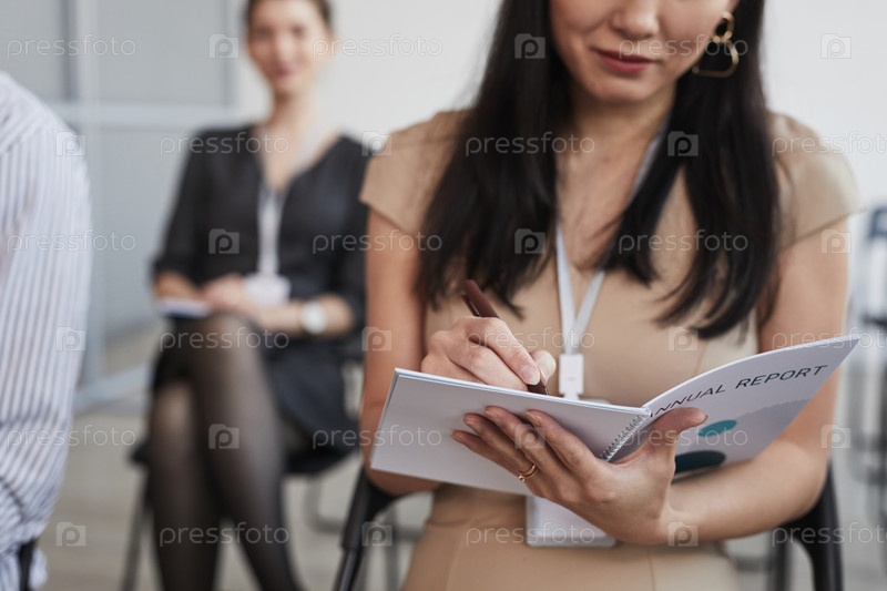 Женщина, делающая заметки на деловой конференции