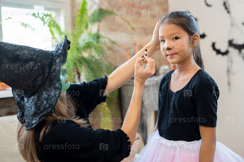 Молодая женщина в колдовской шляпе и черном пуловере наносит макияж Хэллоуина на лицо симпатичной девушки