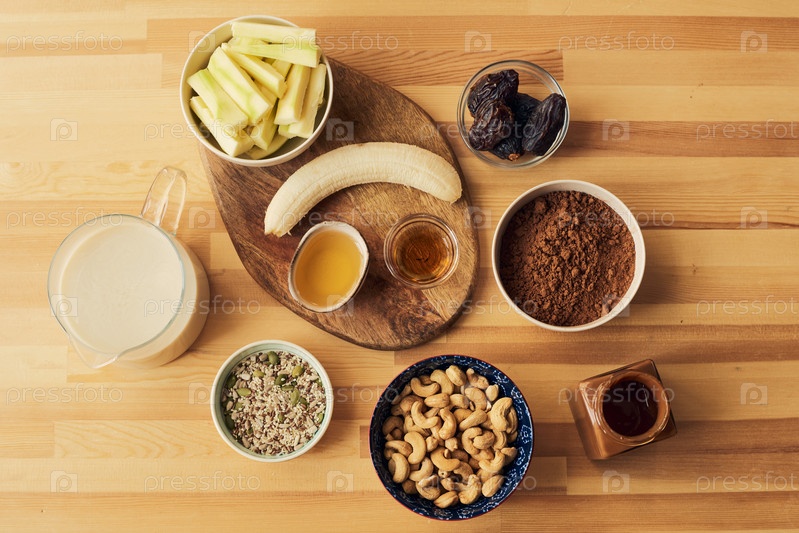 Плоскость ингредиентов для смузи на деревянном кухонном столе