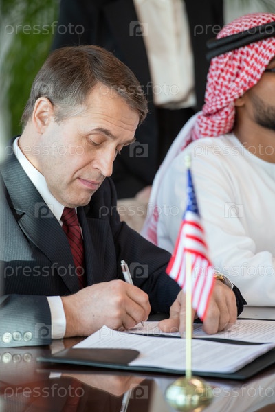 Зрелый серьезный американский делегат, подписывающий договор о деловом партнерстве