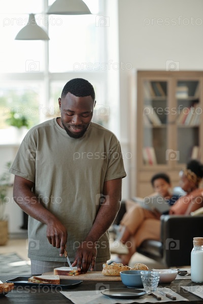 Молодой африканский мужчина в повседневной одежде готовит бутерброды на завтрак у стола на кухне